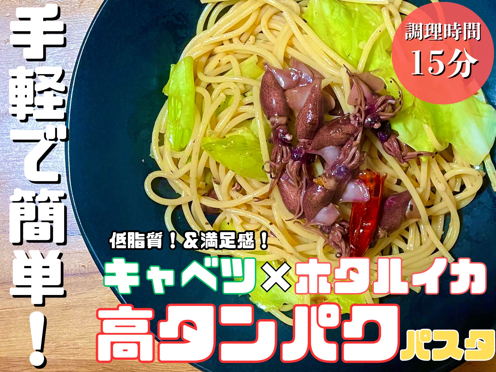 ホタルイカの濃厚な旨みに、キャベツの甘みが相性抜群。オリーブオイルは小さじ1だけなので脂質も控えめで、高たんぱく・低脂質の“ボディメイク向けパスタ”に仕上がります。