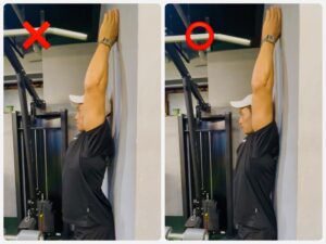 背中を壁につけて立ち、両腕をゆっくりバンザイ。腕が壁に届かない、腰が大きく反るなら胸椎が硬いサインです。