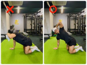四つ這いになり、片手を頭に添えて肘を天井へ開く。十分に回旋できなければ胸椎がスムーズに動いていない可能性があります。